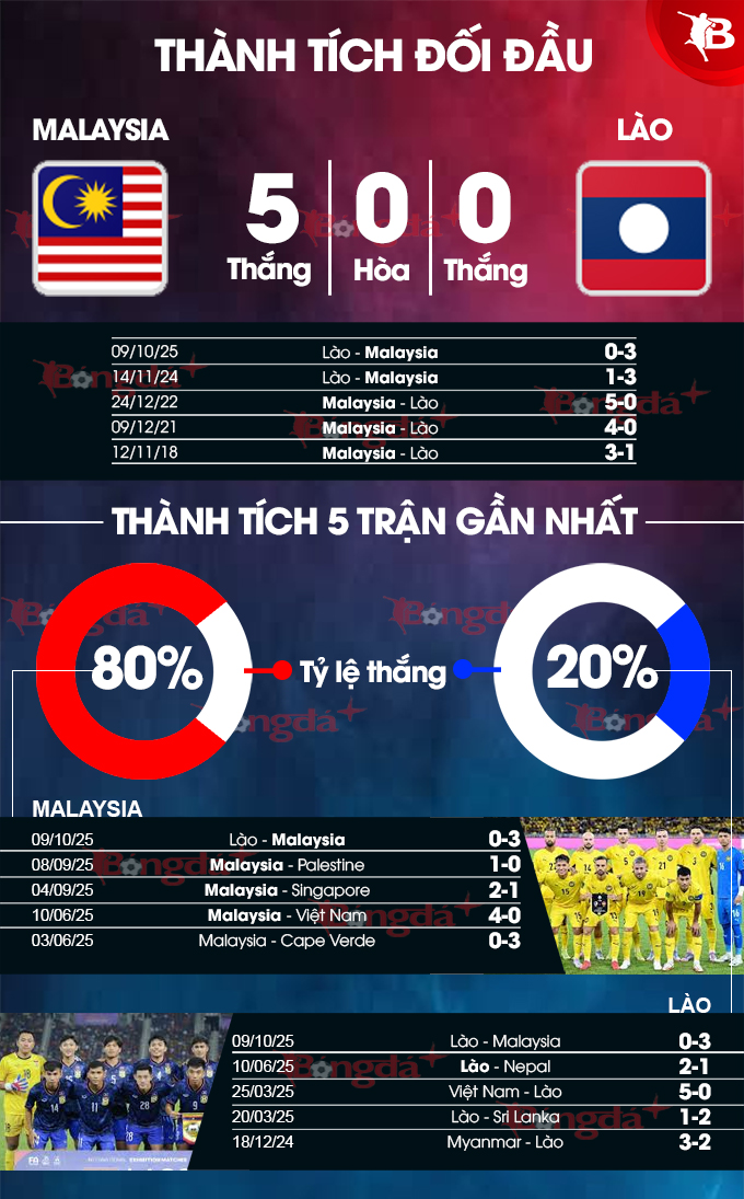 - Số bàn thắng lẻ: 4/5 trận gần nhất của Malaysia có bàn thắng lẻ. 5/5 trận gần nhất của Lào có bàn thắng lẻ.