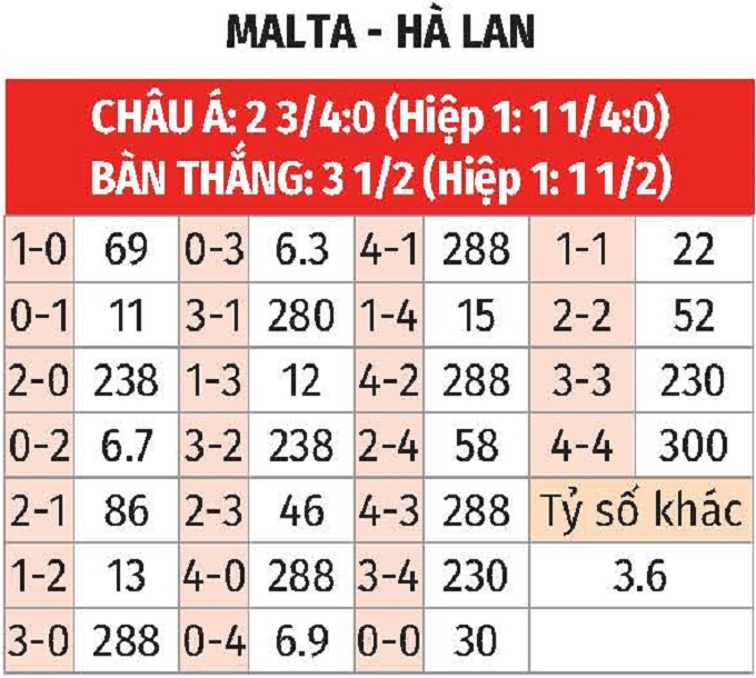 - Hà Lan thắng châu Á hiệp 1: Trận lượt đi chứng kiến Hà Lan sớm dẫn Malta 3 bàn trước khi kết thúc hiệp 1. Tính xa hơn, cả 4 trận vòng loại đều chứng kiến Hà Lan rời sân nghỉ giữa giờ với lợi thế dẫn bàn. Xu thế nhập cuộc bùng nổ và thắng châu Á ngay trong hiệp 1 của Hà Lan có lẽ sẽ tiếp diễn.