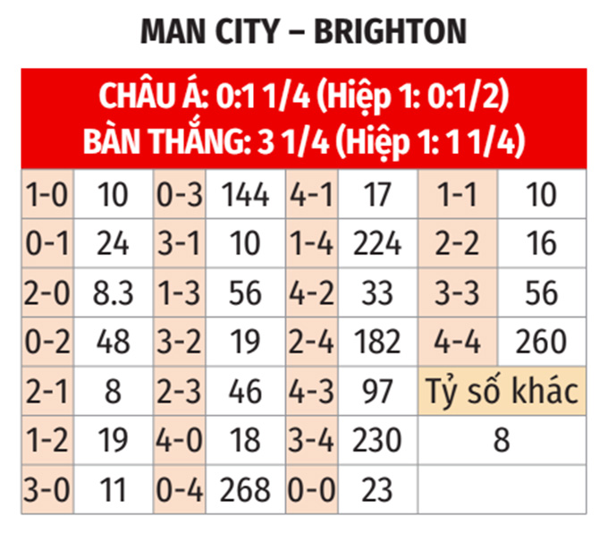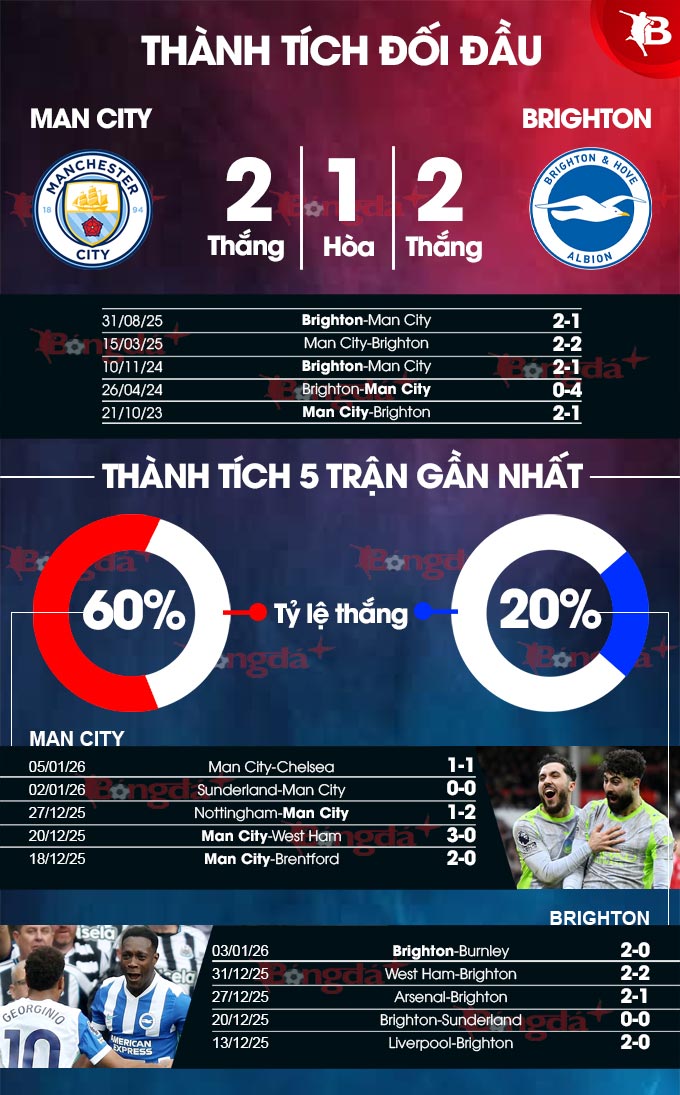 - Hai đội cùng ghi bàn: 8/10 cuộc đối đầu gần nhất đều khép lại với ít nhất 1 bàn thắng cho mỗi đội. Ngoài ra, Man City luôn ghi được ít nhất 1 bàn thắng ở 8/9 trận gần nhất và Brighton cũng làm được điều tương tự ở 7/9 trận vừa qua. Trận này khó có ngoại lệ.