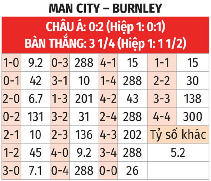 - Tối đa 3 bàn thắng: Lịch sử đối đầu chứng kiến Man City ghi bình quân 4 bàn/trận vào lưới Burnley ở 10 lần gần nhất tiếp đón trên sân Etihad, nhưng kịch bản này khó tái diễn, khi sức công phá của The Citizens mùa này đã giảm sút. Burnley chắc chắn sẽ biết cách để khắc chế nhờ hàng thủ đang chơi không quá tệ.