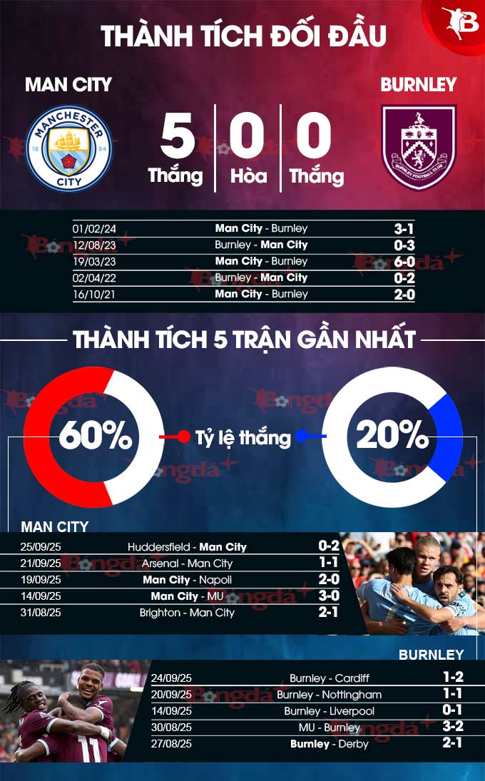 Burnley chưa bao giờ thắng một trận đấu chính thức nào tại sân vận động Etihad, và từ năm 2018 đến năm 2020, họ đã thua 4 trận liên tiếp với tỷ số 5-0 trên sân nhà của Man City. Đây rõ ràng là thống kê khiến NHM đội khách không khỏi lo lắng, nhất là khi chân sút Erling Haaland đang có phong độ cao.