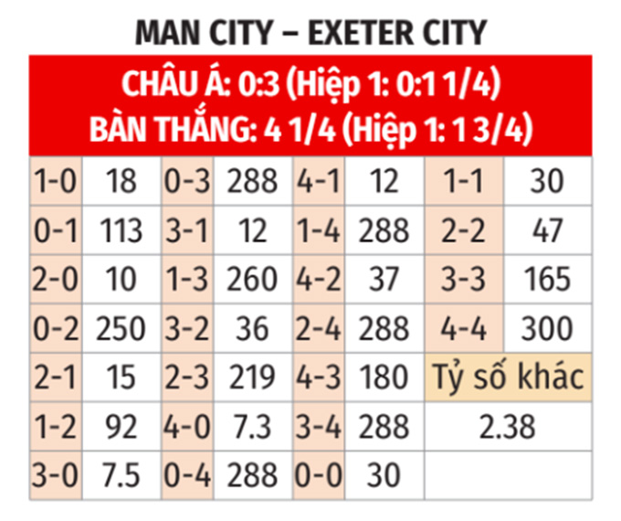 - Không quá 4 bàn cả trận: Cả 9 trận gần nhất của Man City đều khép lại với không quá 4 bàn thắng cả trận. Kết cục tương tự cũng xảy ra ở 6/7 trận gần đây của Exeter City. Ngoài ra, 7/8 trận sân nhà vừa qua của Man City và 16/18 chuyến làm khách gần nhất của Exeter City cũng có tối đa 4 lần lưới rung cả trận.