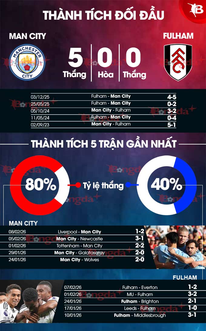 - Từ 3 bàn trở lên: 3 trận liên tiếp của Man City cùng 6/7 trận vừa qua của Fulham đều có từ 3 bàn thắng trở lên. 4/5 trận đối đầu gần nhất thậm chí có tối thiểu 4 pha làm bàn.