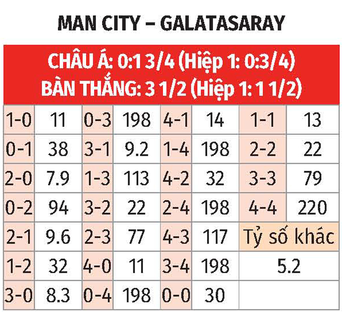 - Dưới 4 bàn: 8/10 trận gần đây của Man City chỉ có tối đa 3 bàn. 7/10 trận gần nhất của Galatasaray số lần lưới rung cũng không lên được tới 4. Ngoài ra, 8/10 trận sân nhà vừa xong của Man City và 7/9 trận sân khách của Galatasaray cũng như thế.