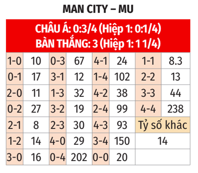 - Không đội nào giữ sạch lưới nhà: 8/10 cuộc đối đầu giữa hai đội đều khép lại mà không bên nào giữ sạch lưới nhà. Ngoài ra, 5/8 trận sân nhà gần đây của Man City và 7/8 trận vừa qua của MU cũng khép lại với ít nhất 1 bàn thắng cho mỗi đội. Đó cũng là kịch bản ở 7/9 chuyến làm khách gần nhất của MU. Được biết, tỷ lệ cược kèo không đội nào giữ sạch lưới nhà ở trận này khá sáng, được niêm yết là đặt 1 ăn 2,88.