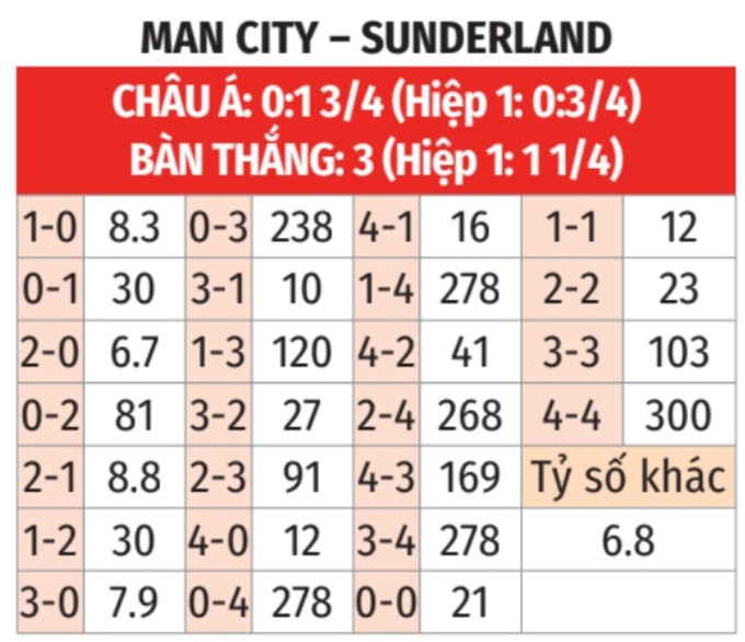 - Lẻ bàn thắng: 6/7 lần gặp giữa 2 đội gần đây kết thúc với tổng số bàn thắng là số lẻ. 5/6 trận vừa qua của Man City và 6/9 trận sân khách vừa qua của Sunderland tương tự.