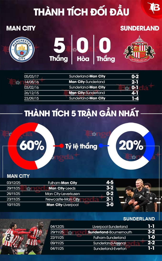 Nhìn chung, Man City ở thời điểm hiện tại rất mạnh. Họ đặc biệt đáng sợ trong tấn công với “mũi đinh ba” gồm Jeremy Doku, Phil Foden và Erling Haaland đều đang đạt phong độ rất cao, trong đó Haaland đang dẫn đầu danh sách “Vua phá lưới” ở Premier League với 15 bàn thắng. Thế nên, khả năng Man City xé lưới của Sunderland để giành 3 điểm là rất cao.
