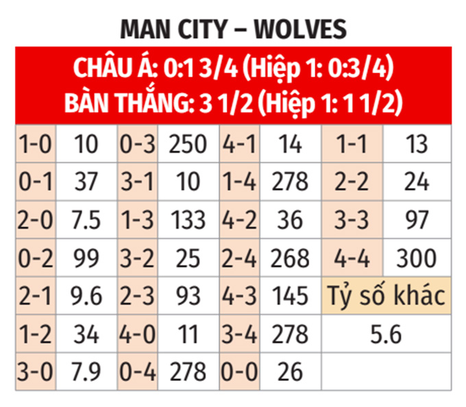 Với những lợi thế về đối đầu và lực lượng cũng như sân nhà, Man City hoàn toàn có thể giành được 3 điểm trọn vẹn ở cuộc đối đầu này, nhưng Wolves mới là đội nhiều khả năng sẽ thắng theo châu Á.