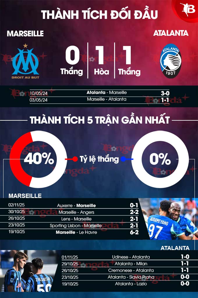 - Atalanta thua theo châu Á: Atalanta thua 5, hòa 1 ở 6 trận gần nhất; thua 5/7 chuyến làm khách gần đây. Trong khi đó, Marseille thắng 6/7 trận sân nhà vừa qua. Vì thế, rất có thể Atalanta lại thua theo châu Á ở trận này.