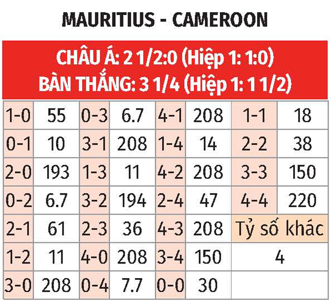 - Nhiều bàn hiệp 1: 2 trận chính thức gần nhất của Mauritius có tối thiểu 1 lần lưới rung hiệp 1. 2/3 trận chính thức vừa xong của Cameroon có kịch bản tương tự. NHM nên đợi sau 15 phút đầu thì đặt niềm tin vào nhiều bàn hiệp 1.