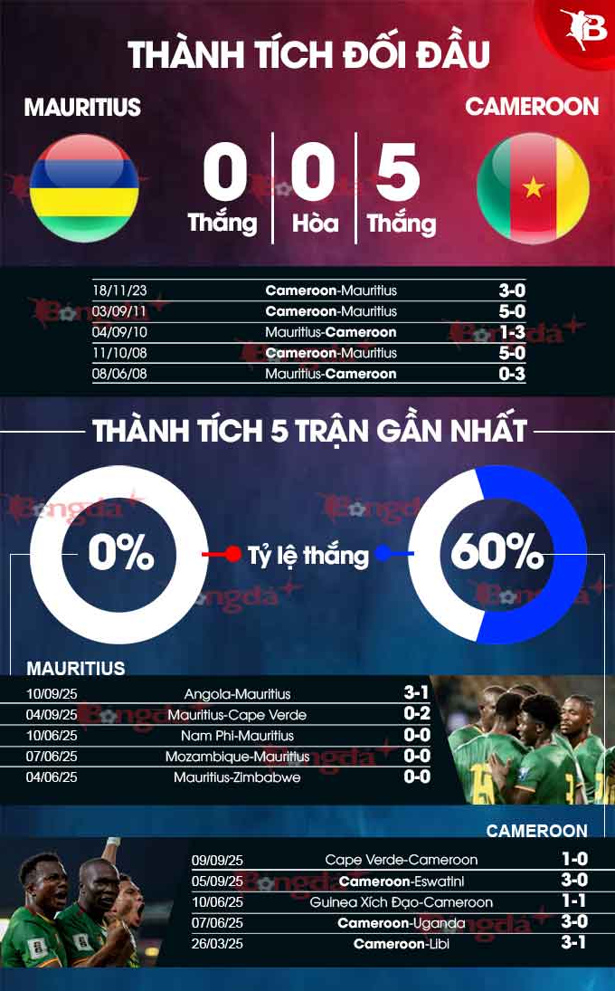 Ngay cả khi Mauritius có lợi thế sân nhà, họ cũng không thể so sánh với Cameroon. Cameroon có đội hình kinh nghiệm và ở đẳng cấp cao hơn đối thủ. Chưa hết, về thành tích đối đầu trực tiếp, Cameroon toàn thắng trước Mauritius ở 5 trận gần nhất. Nhiều khả năng, Bryan Mbeumo và các đồng đội sẽ có 3 điểm ở trận này