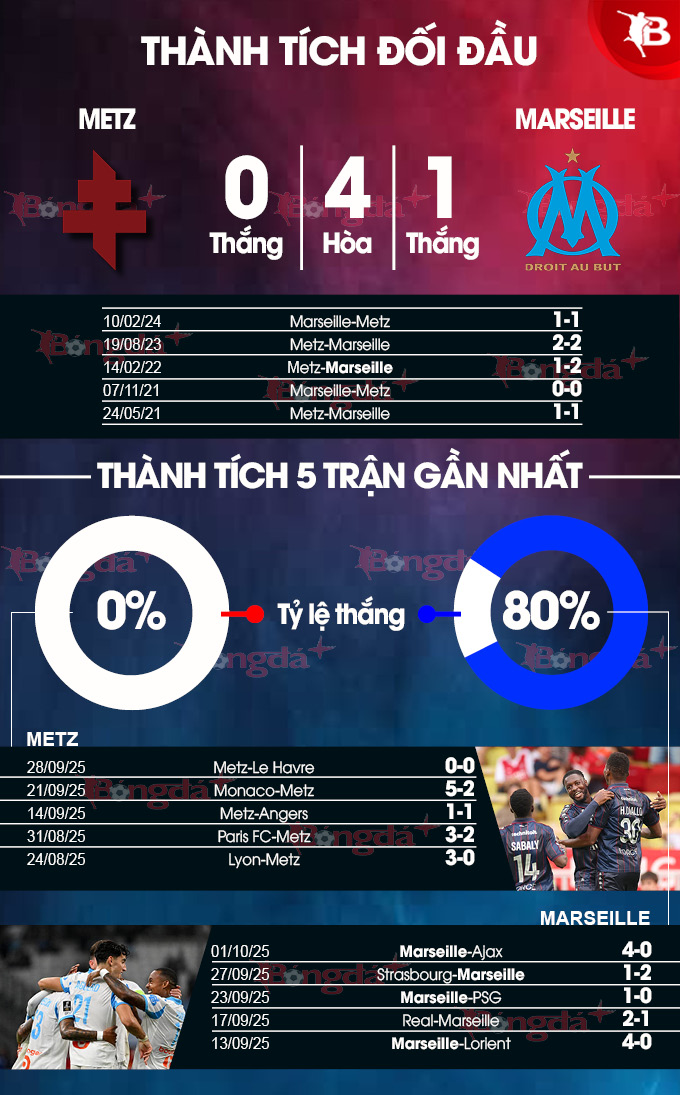 Ngoài ra, Metz đã có điểm trong 6/7 lần gặp OM trước đó tại Ligue 1, nhưng chưa từng đánh bại đội bóng thành phố Cảng trên sân nhà kể từ năm 2017 (1-0). Và, Marseille đang thể hiện bản lĩnh tuyệt vời sau thất bại gây tranh cãi trước Real Madrid trong trận mở màn Champions League 2025/26 (1-2).