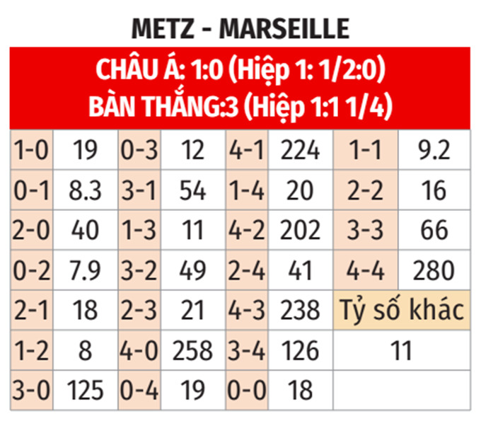 - Marseille ghi bàn hiệp 1: Marseille ghi 1 bàn trong hiệp 1 ở 2/3 cuộc đối đầu gần nhất, ở cả 2 chuyến làm khách vừa qua tại Metz. Ngoài ra, họ cũng luôn ghi bàn trong hiệp 1 ở 7/10 trận gần đây. Vì thế, rất có thể đội bóng của HLV Roberto De Zerbi cũng sẽ ghi được bàn thắng ở hiệp đấu đầu tiên.