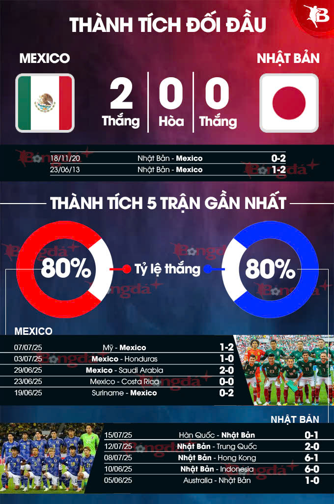 Trong 5 trận gần nhất, Mexico bất bại (thắng 4, hòa 1), ghi 7 bàn và chỉ thủng lưới 1 lần. Nhật Bản cũng có phong độ khá cao khi thắng 4, thua 1 trong 5 trận gần nhất. Đội bóng châu Á ghi được tới 15 bàn và chỉ thủng lưới 2 lần.