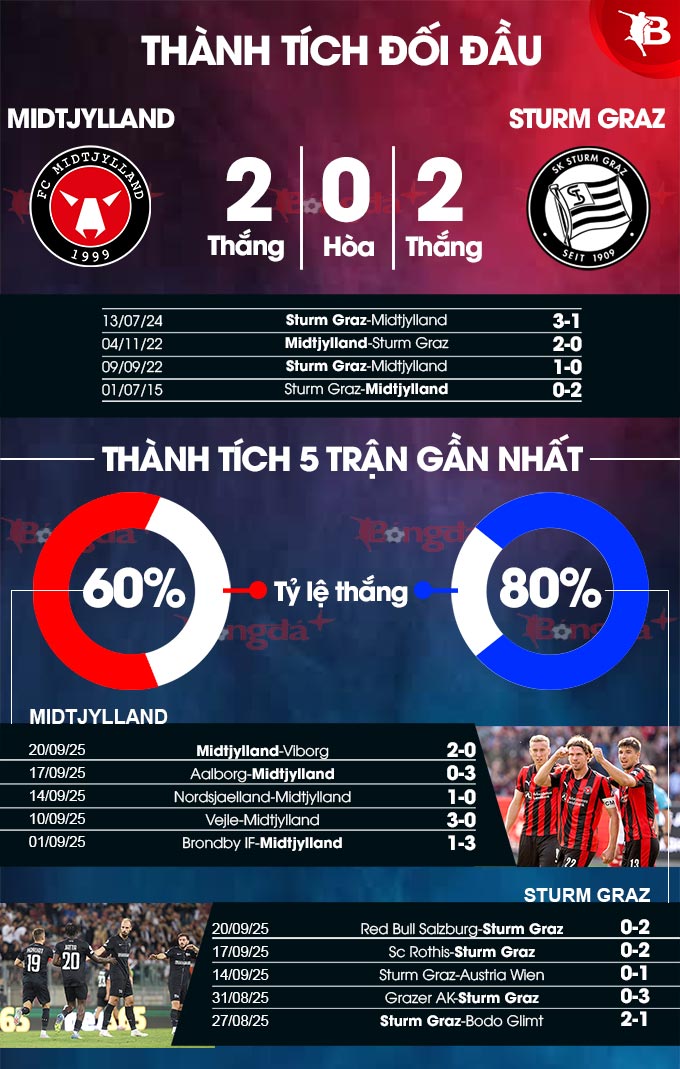 - Ít bàn thắng: Cả 3 trận gần đây của Midtjylland chỉ có tối đa 2 bàn. 4/5 trận vừa qua của Sturm Graz cũng diễn ra theo kịch bản tương tự.