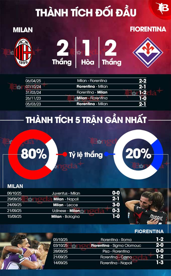 - Milan ghi bàn trong hiệp 1: Milan ghi ít nhất 1 bàn trong hiệp 1 ở 4/5 lần gần nhất đón tiếp Fiorentina. Ngoài ra, họ cũng làm được điều tương tự ở 3/4 trận vừa qua, ở 4/5 trận sân nhà vừa qua.