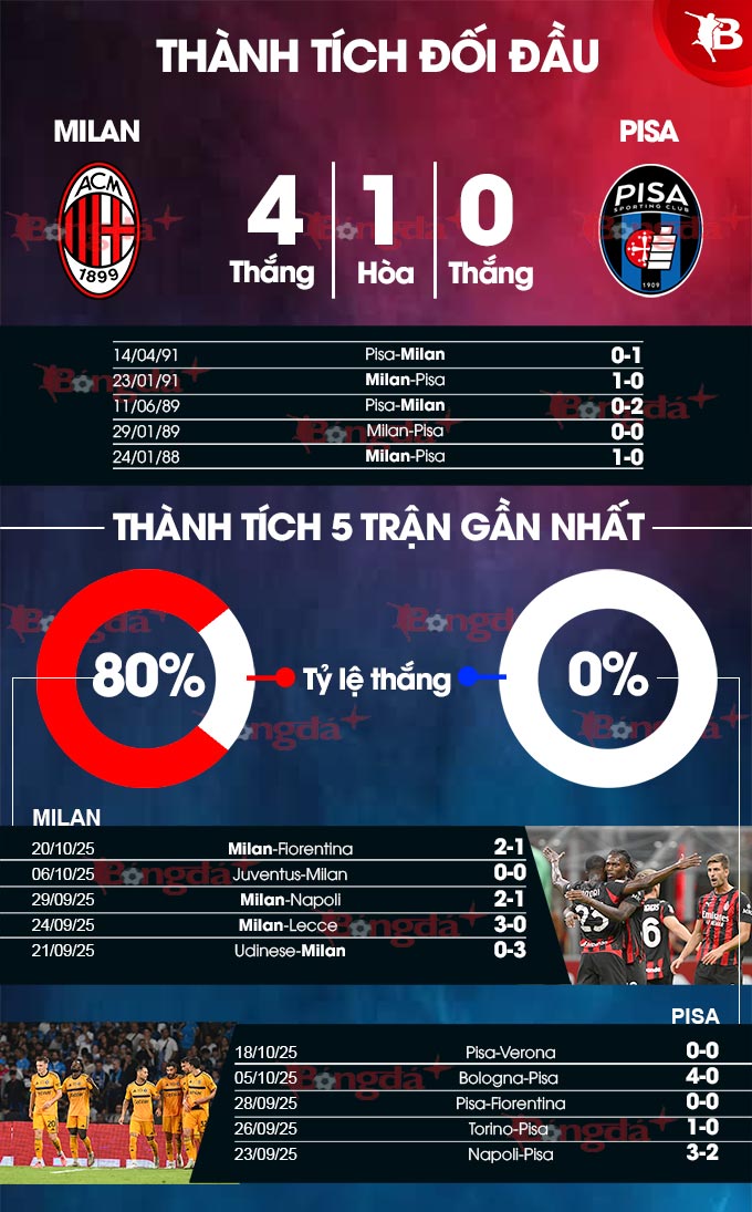 Nên nhớ rằng, Milan còn có sự ủng hộ của quá khứ. Theo thống kê, trong 10 lần chạm trán giữa 2 đội gần nhất, đội bóng áo sọc đỏ đen bất bại trước Pisa. Cụ thể, họ thắng 9, chỉ để đối phương cầm hòa 1 trận.