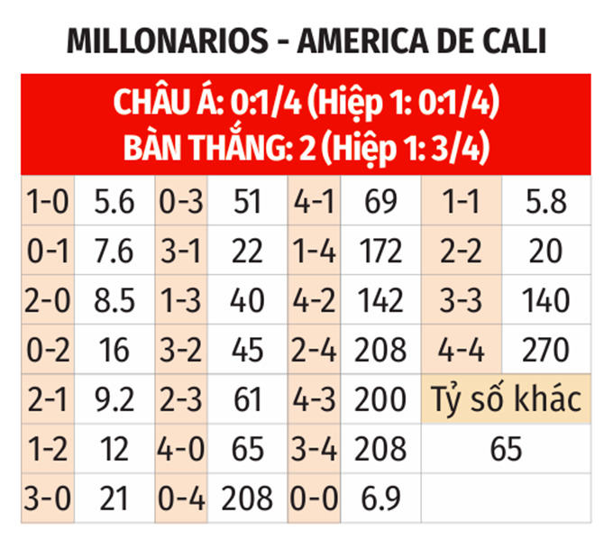 - Hiệp 1 có bàn thắng: 9/12 cuộc đối đầu gần nhất, 5/8 trận gần đây của Millonarios và America de Cali đều có ít nhất 1 bàn trong hiệp 1. Hơn nữa, 6/7 trận sân nhà của Millonarios và 6/7 America de Cali cũng chứng kiến 1 lần lưới rung hiệp 1. Trận này khó có ngoại lệ.