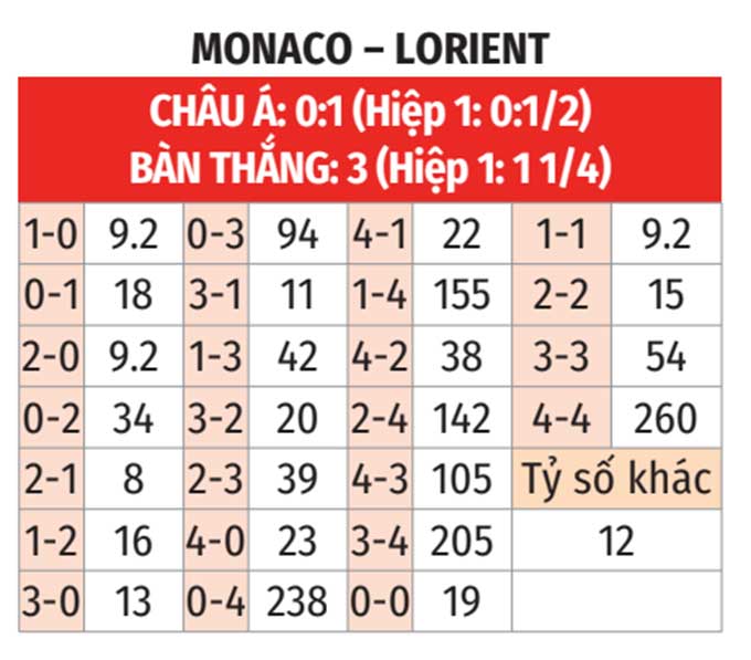 - Monaco thua hiệp 1 theo châu Á: Trong 10 trận Lorient gần đây, Monaco thua hiệp 1 theo châu Á tới 9 lần. Đá với đối thủ mới thắng hiệp 1 theo châu Á ở 6/8 trận vừa qua, đội chủ nhà không phải là sự lựa chọn đáng tin cậy.