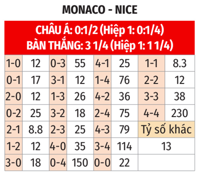 - Monaco thắng theo châu Á: Monaco thắng 2/3 trận gần nhất, thắng 6/9 trận sân nhà gần đây. Trong khi đó, Nice thua 8, hòa 1, thắng 1/10 trận gần đây; thua cả 5 chuyến xa nhà vừa qua. Do đó, những người yêu mến Monaco có thể tin tưởng họ ở trận này.