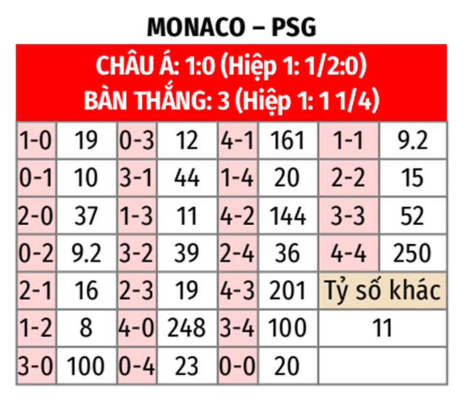 - Hiệp 1 tối đa 1 bàn: 4/5 cuộc đối đầu gần nhất, 5/6 trận gần đây của Monaco và 7/10 trận vừa qua của PSG đều có không quá 1 bàn trong hiệp đấu đầu tiên. Ngoài ra, 5/6 cuộc đối đầu vừa qua tại Louis II, 5/7 trận sân nhà gần nhất của Monaco và 3/4 chuyến làm khách gần đây của PSG cũng khép lại với kịch bản tương tự trong hiệp 1.