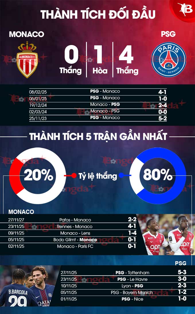 Tính trên mọi đấu trường, Monaco của tân HLV Sebastien Pocognoli cũng chỉ thắng đúng 1 lần ở 5 trận gần nhất. Tệ hơn, họ luôn bị dẫn bàn trong hiệp đấu đầu tiên ở 3 trận không thắng vừa qua. Mà nên nhớ, PSG là chuyên gia phá lưới đối phương ở hiệp đấu đầu tiên. Họ làm được điều đó ở 3 trận gần nhất, ở 5/8 chuyến làm khách vừa qua.