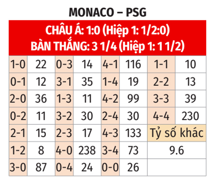 - Hiệp 1 tối thiểu 2 bàn: 4/6 cuộc chạm trán gần nhất giữa hai đội tại Ligue 1 đều chứng kiến ít nhất 2 bàn trong hiệp 1. Ngoài ra, 2/3 trận gần đây của Monaco và 7/11 trận vừa qua của PSG đều có tối thiểu 2 bàn trong hiệp đấu đầu tiên. Không những thế, 5/8 trận sân nhà gần đây của Monaco và 5/8 chuyến làm khách gần nhất của PSG cũng có kịch bản tương tự trong hiệp 1. Trận này khó có ngoại lệ.