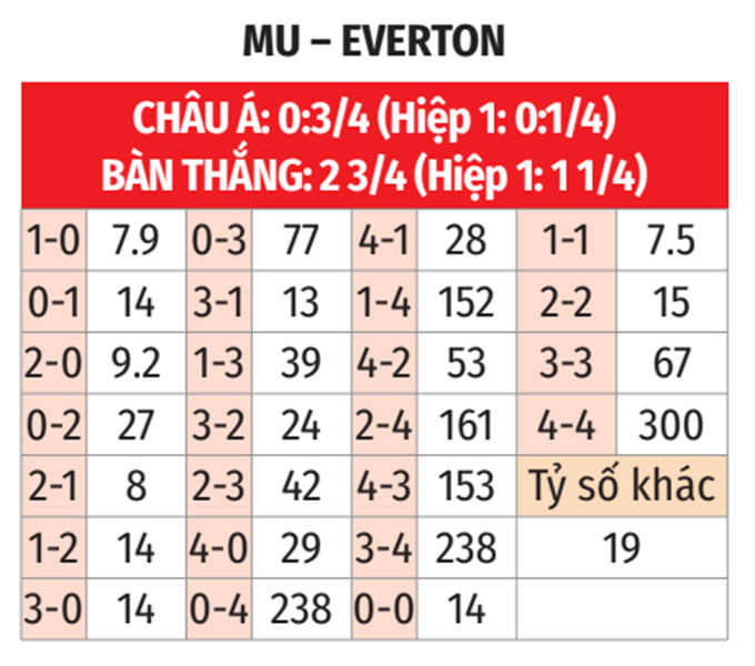 - MU thắng theo châu Á: MU đang có chuỗi 3 trận thắng theo châu Á liên tiếp trên sân nhà. Trong khi đó, Everton lại thua theo châu Á ở 6/8 trận gặp MU gần đây nên họ không phải là sự lựa chọn đáng tin cậy.