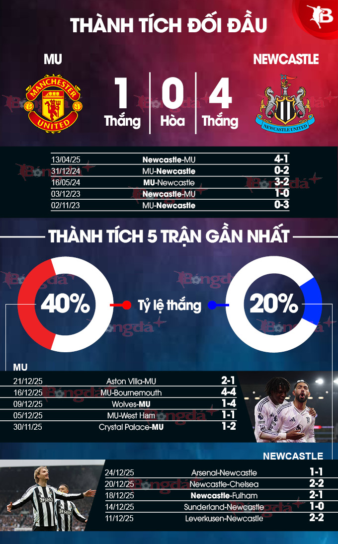 Nếu chỉ gói gọn trong Ngoại hạng Anh, Newcastle cũng chỉ thắng 1 trận khi xa nhà kể từ khi mùa giải mới khởi tranh. Điểm tựa để MU tin vào 1 thắng lợi trước Newcastle đến từ việc, họ chỉ thua đối thủ có 1/11 trận gần nhất tại "Nhà hát của những giấc mơ". Đây sẽ là trận đấu quyết liệt và khó lường. MU có khả năng thắng nhưng cách biệt không lớn.