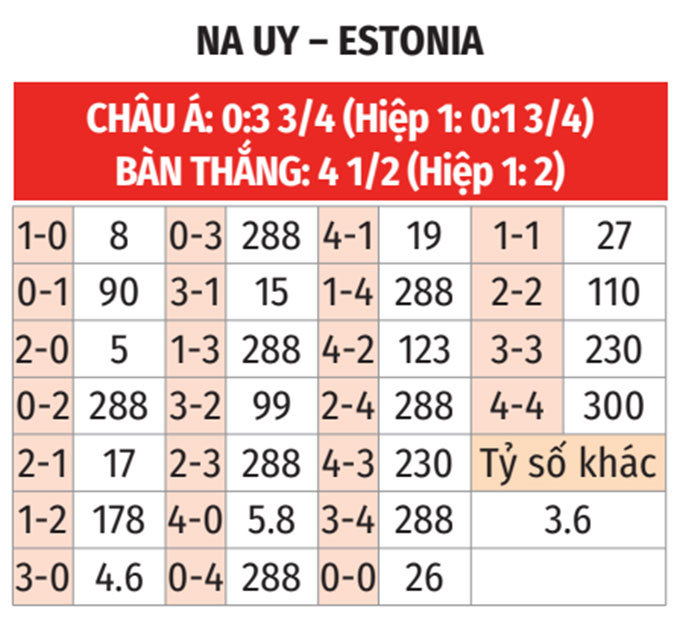 - Dưới 10 quả phạt góc: Cả 3 trận vừa qua của Estonia chỉ có tối đa 9 quả phạt góc. Cả 7 trận gần đây của Na Uy số phạt góc cũng không lên được 10.