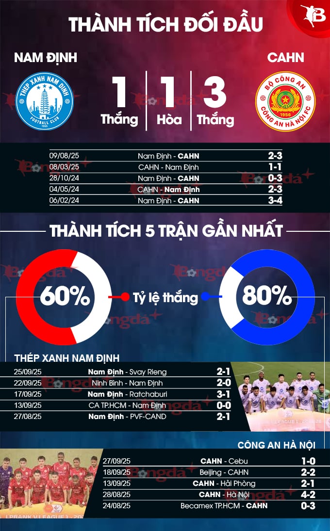 CAHN chưa bao giờ được xem là đối thủ dễ chơi với Nam Định. Đội bóng lực lượng vũ trang được xem là “khắc tinh” của chủ nhà. Trong 5 lần gặp nhau gần nhất, CAHN thắng 3, hòa 1 và chỉ thua 1 trận. Gần nhất, Nam Định thất thủ với tỷ số 2-3 trước CAHN ở trận tranh Siêu cúp QG đầu mùa ngay tại Thiên Trường. Trong bối cảnh hiện tại, Nam Định nhiều khả năng sẽ tiếp tục có thêm một trận đấu khó khăn nữa trước CAHN.