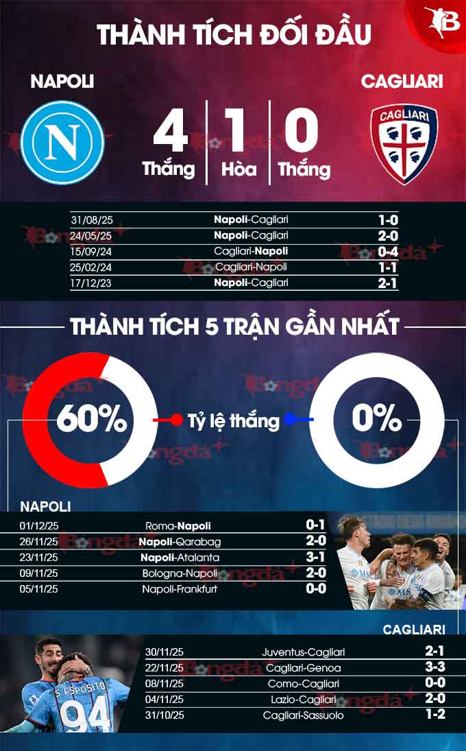 Họ sẽ phải ưu tiên trụ hạng hơn là bung sức làm khó Napoli. Phong độ của Napoli vs Cagliari đang rất khác biệt. Trong khi Napoli chỉ thua 1/8 trận gần nhất thì Cagliari chỉ thắng 1/10 trận vừa qua.
