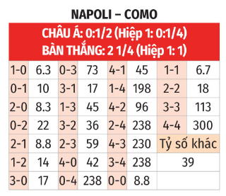 - Napoli thắng theo châu Á: Napoli nhường 1/2 bàn trước Como trên sân nhà đương nhiên là quá rẻ, nhưng cần lưu ý rằng nhà ĐKVĐ Serie A đang thiếu cả Romelu Lukaku lẫn Kevin De Bruyne. Không xét tới tỷ lệ châu Á, Napoli thắng 7/8 trận Serie A gần đây khi được thị trường đánh giá cao hơn đối phương. Como thua 4/5 trận sân khách vừa qua khi được nhường 1/2 bàn trở lên. Napoli cũng thắng cả 2 lần gần nhất tiếp đón Como trên sân nhà.