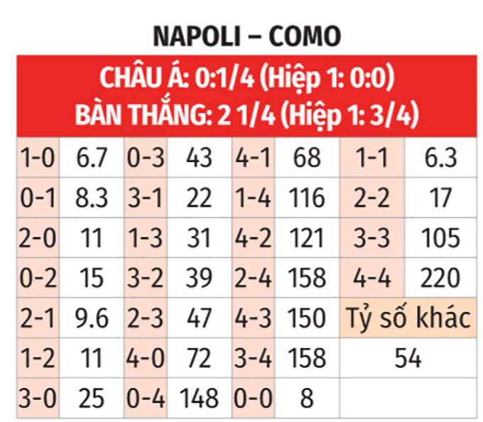 - Tỷ số chẵn: 3/4 trận gần nhất giữa Napoli và Como đều kết thúc với tỷ số chẵn. 5/6 trận vừa qua của Como cũng có số bàn thắng chia hết cho 2.