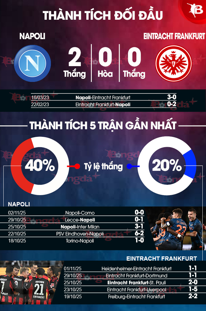 Trong 2 lần chạm trán Napoli gần đây, Eintracht Frankfurt chẳng những toàn thua mà họ còn chẳng ghi nổi bàn thắng nào. Gặp lại Napoli trên sân khách, khả năng cao là Eintracht Frankfurt sẽ không chống nổi đại diện Italia, vốn rất mạnh nhận được sự cổ vũ của đám đông khán giả nhà.