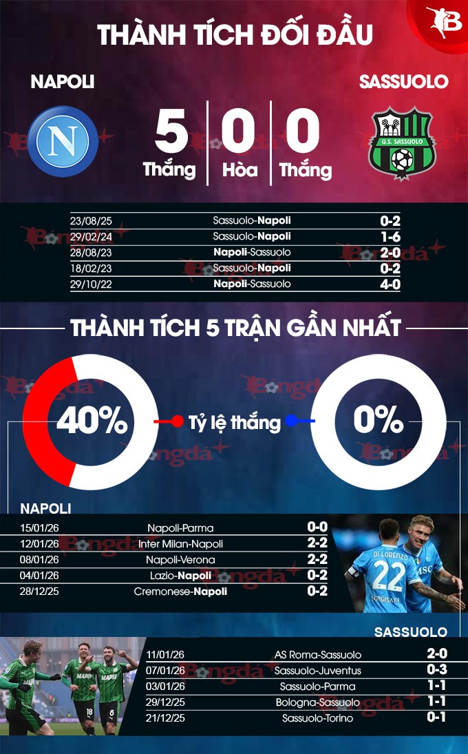 Với thành tích tệ hại như vậy, rất khó để tin rằng Sassuolo có thể đứng vững khi viếng thăm sào huyệt của "hung thần" mang tên Napoli. Nên biết, trong 6 lần chạm trán Sassuolo gần đây, Napoli luôn khiến đối phương phải nhận thất bại với cách biệt trên 1 bàn.