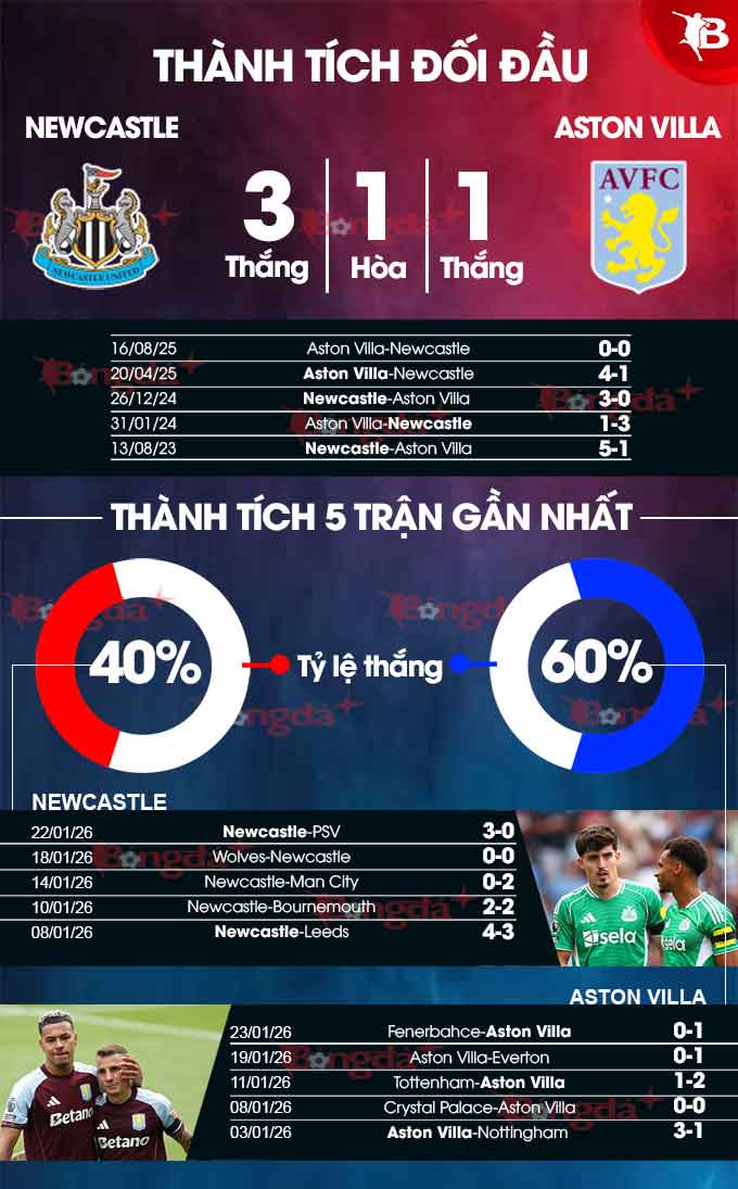 Có nhiều lý do để tin vào một chiến thắng dành cho chủ nhà Newcastle lần này. Thứ nhất, Chích chòe đang duy trì chuỗi 8 trận bất bại trên sân nhà tại Ngoại hạng Anh (6 thắng, 2 hòa) và đã khởi đầu năm 2026 với hai chiến thắng liên tiếp tại St James' Park, khi đánh bại Crystal Palace và Leeds.