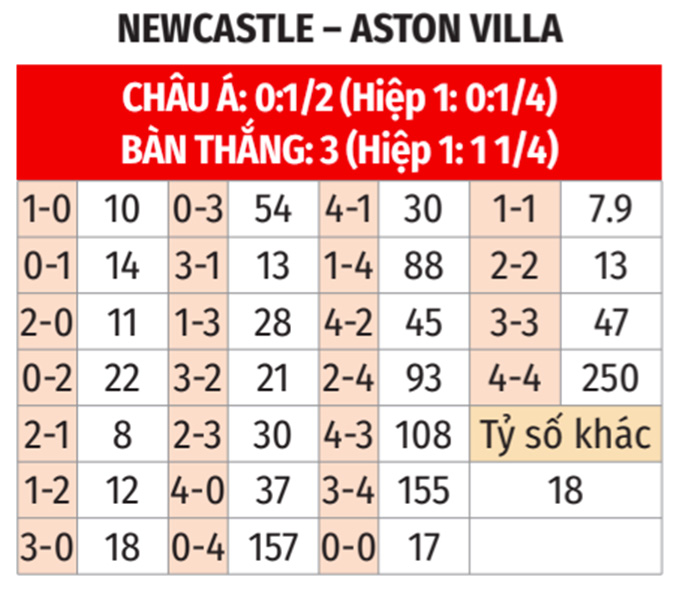 - Tối đa 1 bàn trong hiệp 1: 10/12 cuộc đối đầu gần nhất tại sân Villa Park đều có không quá 1 bàn trong hiệp 1. Ngoài ra, 3/4 trận gần đây của Newcastle và 4/5 trận vừa qua của Aston Villa đều chứng kiến không quá 1 lần lưới rung trong hiệp đấu đầu tiên.