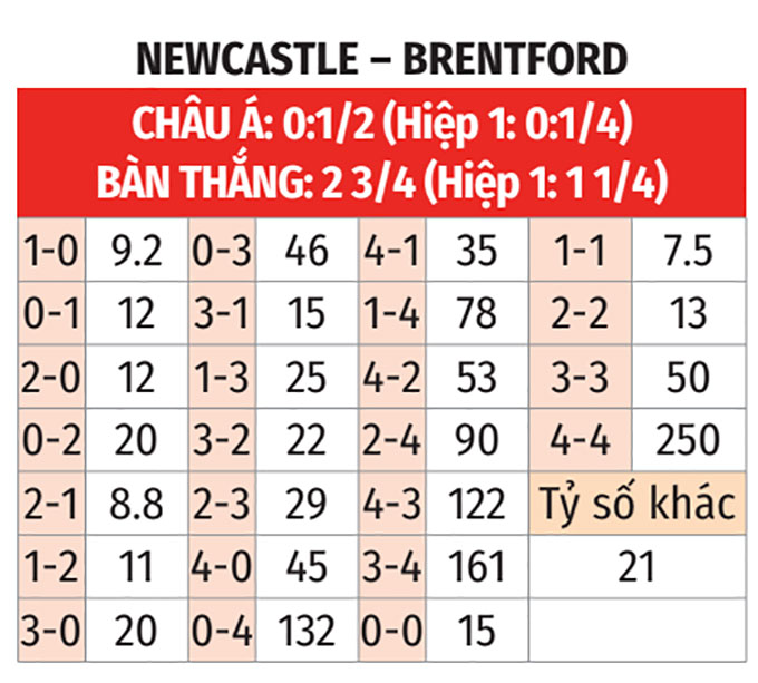 • Newcastle thua hiệp 1 theo châu Á: Newcastle thua hiệp 1 theo châu Á. Đá với Brentford thắng hiệp 1 theo châu Á ở 4/6 trận vừa qua, Newcastle không phải là sự lựa chọn đáng tin trước giờ nghỉ.