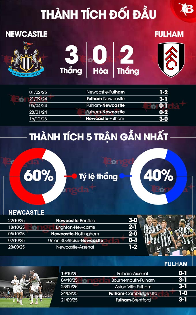 Đặc biệt, Newcastle thường hay át vía Fulham khi được thi đấu trên sân nhà. Thống kê chỉ ra rằng, đội bóng vùng Đông Bắc nước Anh chỉ để thua 1/9 lần tiếp đón Fulham gần đây trong khuôn khổ giải Ngoại hạng Anh, còn lại họ thắng 5 và hòa 3 trận.