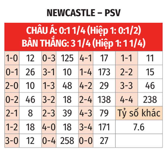 - Newcastle thua hiệp 1 theo châu Á: Newcastle thua hiệp 1 theo châu Á ở 4/5 trận gần nhất. Đá với PSV thắng hiệp 1 theo châu Á ở 5/7 trận vừa qua, Chích chòe không phải là sự lựa chọn đáng tin trước giờ nghỉ.