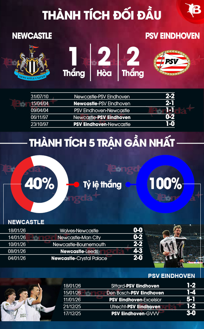 - Tối thiểu 2 bàn hiệp 1: Cả 3 trận gần đây giữa Newcastle và PSV đều có tối thiểu 2 bàn trong hiệp 1. 8/9 trận gần đây của PSV cũng diễn ra theo kịch bản này.