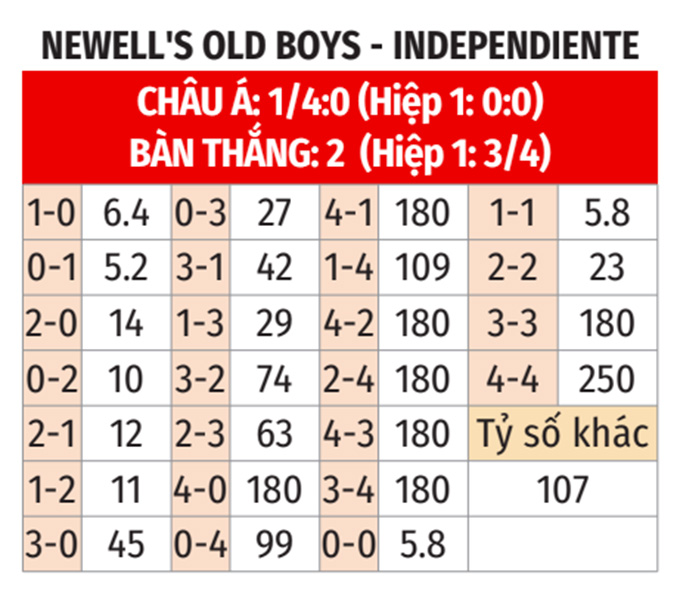 - Hiệp 1 có bàn thắng: 8/10 cuộc đối đầu gần nhất, 5/7 trận vừa qua của Newell’s Old Boys và 5/8 trận gần đây của Independiente đều có ít nhất 1 bàn thắng trong hiệp 1. Hơn nữa, 6/7 cuộc đụng độ gần đây tại sân nhà của Newell’s Old Boys đều chứng kiến tối thiểu 1 lần lưới rung hiệp 1. Trận này khó có ngoại lệ.