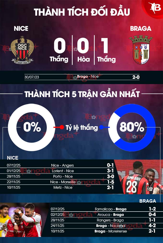 - Hai đội cùng ghi bàn: Nice luôn ghi ít nhất 1 bàn ở 17/19 trận gần đây, ở 8/9 trận sân nhà vừa qua. Còn 6/7 trận vừa qua của Braga cũng khép lại với ít nhất 1 bàn thắng cho mỗi đội. Kịch bản tương tự cũng xuất hiện ở 6/9 chuyến làm khách vừa qua. Trận này khó có ngoại lệ.