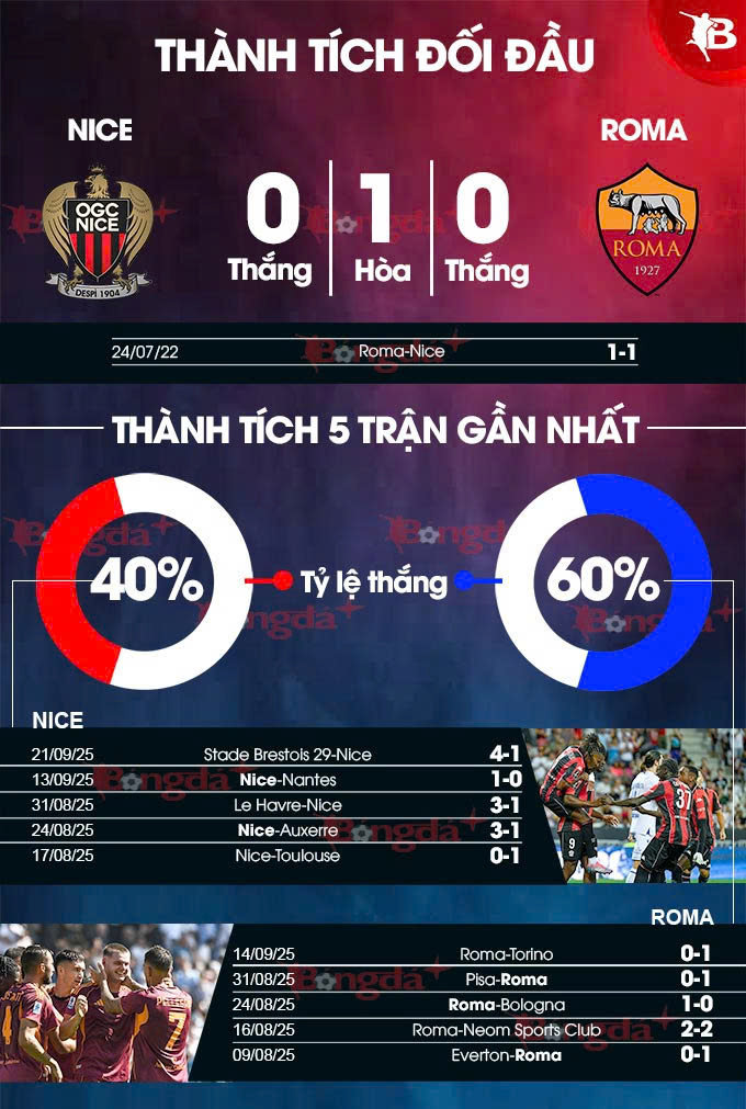 Đang trong giai đoạn khó khăn, Nice sẽ phải đối mặt với thử thách mang tên Roma ở vòng khai mạc Europa League 2025/26. Khác với Nice, Roma đang xếp thứ 4 trên BXH Serie A 2025/26 khi đang có 9 điểm, và chỉ kém 1 điểm so với Juventus.
