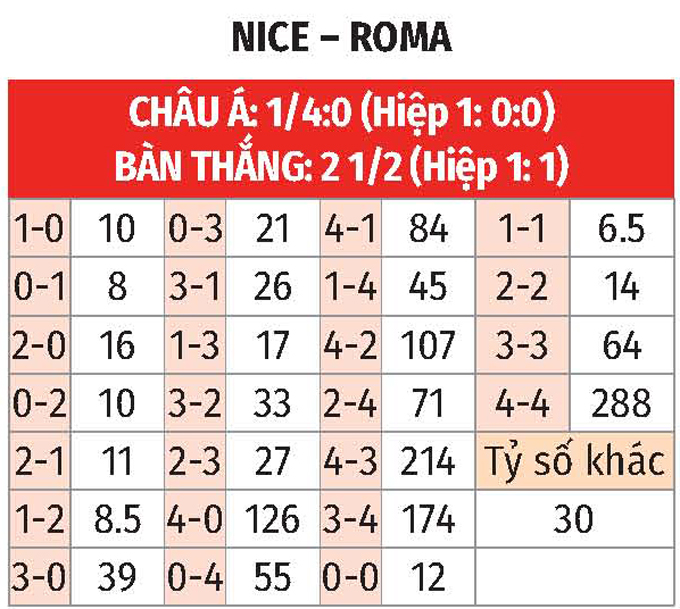 - Lẻ bàn thắng: 3/5 trận gần nhất của Nice có tổng bàn thắng không chia hết cho 2. Ngoài ra, 4 trận vừa qua Roma đều chứng kiến điều tương tự.