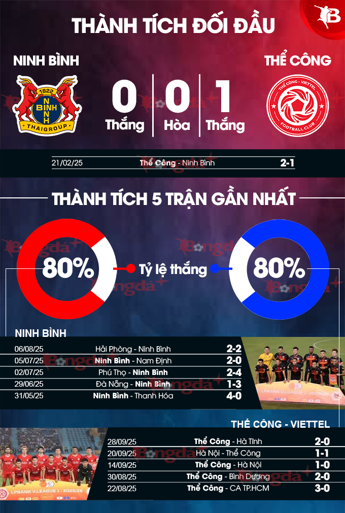 Hai đội chỉ mới đối đầu nhau 1 lần ở trận giao hữu diễn ra cách đây 5 năm và thời điểm đó mọi thứ vẫn đang rất khác so với hiện tại, nên thực tế trận đấu ấy chỉ mang tính tham khảo, dẫu Thể Công Viettel thắng 2-1. Giờ đây, Ninh Bình dù là tân binh, nhưng đây là đội bóng được xem là có lực lượng ổn nhất trong thời điểm này với một loạt ngôi sau như Văn Lâm, Hoàng Đức, Thanh Bình, Quang Nho, Thế T, Đức Chiến, Ngọc Quang, Geovane… nên đang được xem là một thế lực của V.League.