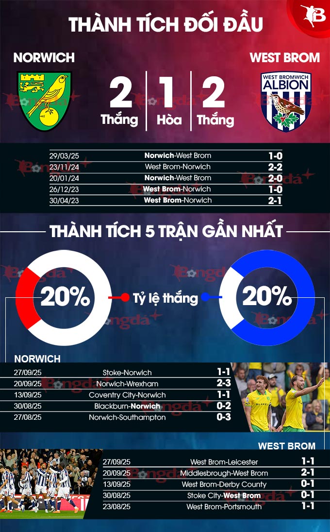 Norwich có ưu thế sân nhà và đối đầu nhưng lại sở hữu phong độ rất tệ. Trong khi West Brom thắng 2/3 chuyến làm khách gần đây và có thể họ cũng sẽ ca khúc khải hoàn lần này.