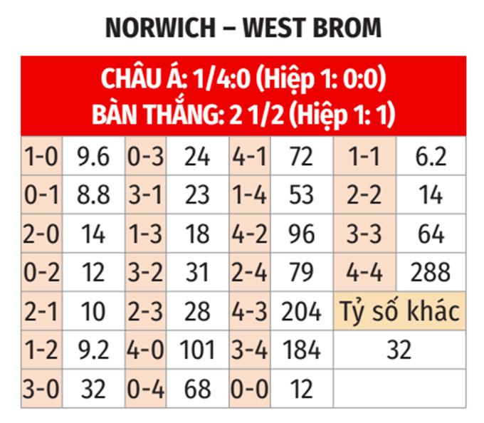 - Lẻ bàn thắng: 8/12 cuộc đối đầu gần nhất, 6/9 trận gần đây của cả Norwich lẫn West Brom đều khép lại với tổng bàn thắng là lẻ. Ngoài ra, 5/6 trận sân nhà vừa qua của Norwich và 6/9 chuyến xa nhà gần đây của West Brom cũng khép lại với tổng bàn thắng không chia hết cho 2.