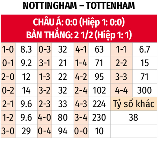 - Hiệp 1 có bàn thắng: 7/8 trận sân nhà gần đây của Nottingham cùng 10/11 trận vừa qua của Tottenham đều có ít nhất 1 bàn thắng trong hiệp đầu tiên. 5 trận đối đầu gần nhất cũng xuất hiện bàn thắng trước giờ nghỉ, với 3 trong số đó có 2 bàn.